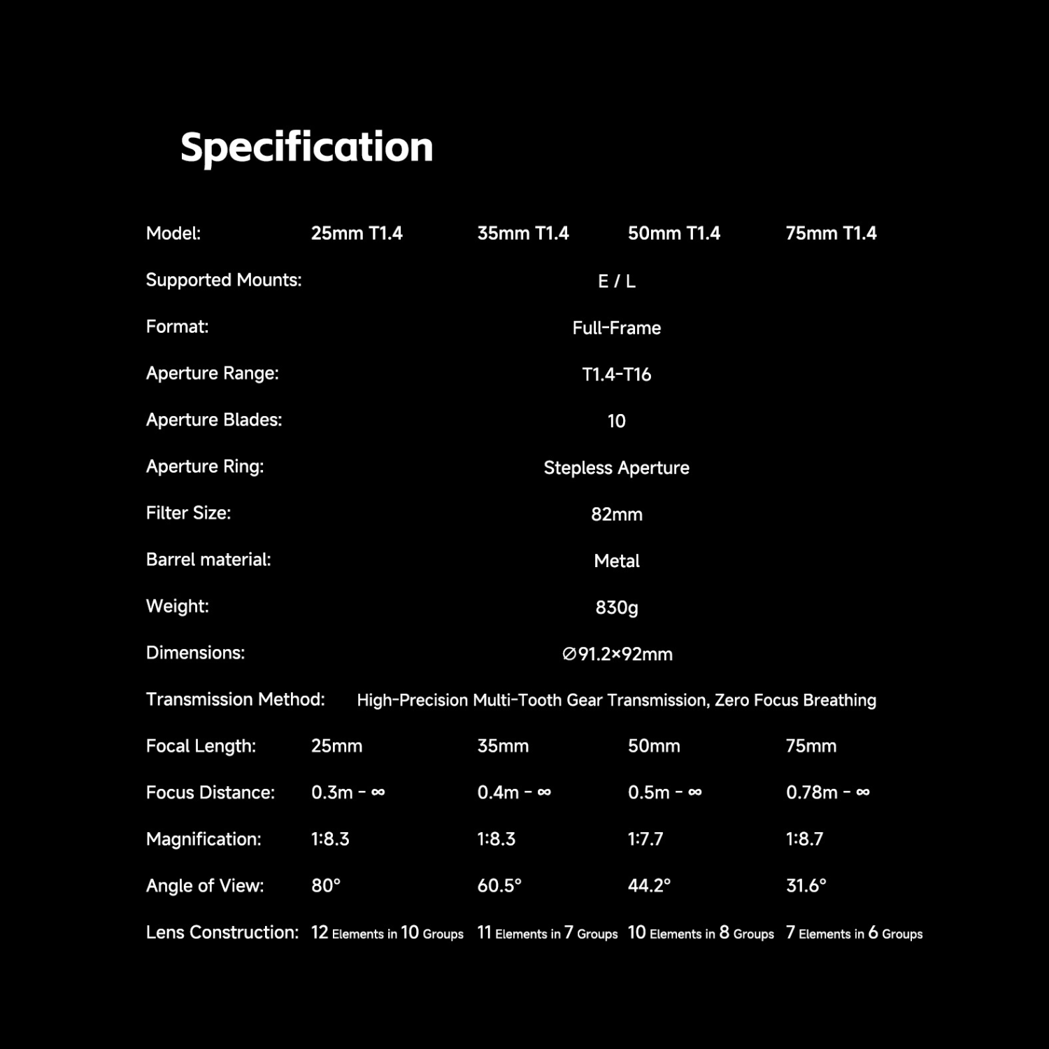 All lenses in the series share the same fast T1.4 aperture, allowing for exceptional low-light performance and the ability to create beautiful, shallow depth of field with cinematic bokeh. Crucially, they are engineered with the exact same form factor, shape, and weight. This means you can swap lenses on a gimbal, or other camera rig without needing to re-balance, saving valuable time on set.